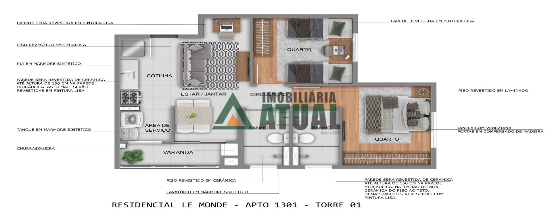 Apartamentos de 02 quartos, opções com suíte, 47,84, 47,96, 48,22, 48,34 e 50,7m² e vaga de garagem. Área de lazer com salão de festas, playground, pet place, espaço gourmet, piscinas adulto e infantil, churrasqueira, bicicletário, sala de estudos e lavanderia.
