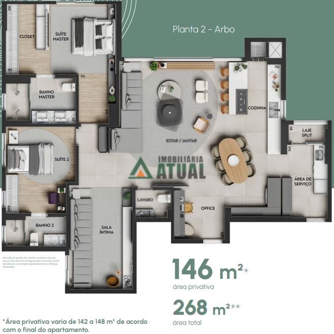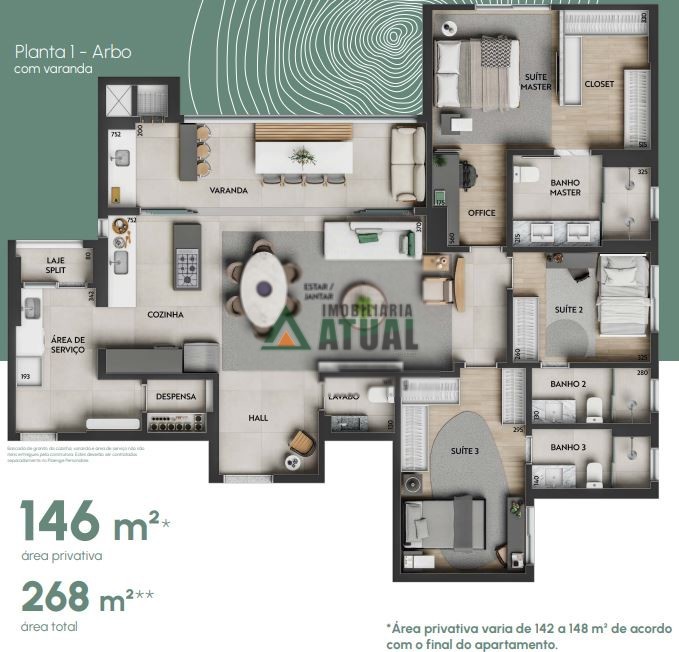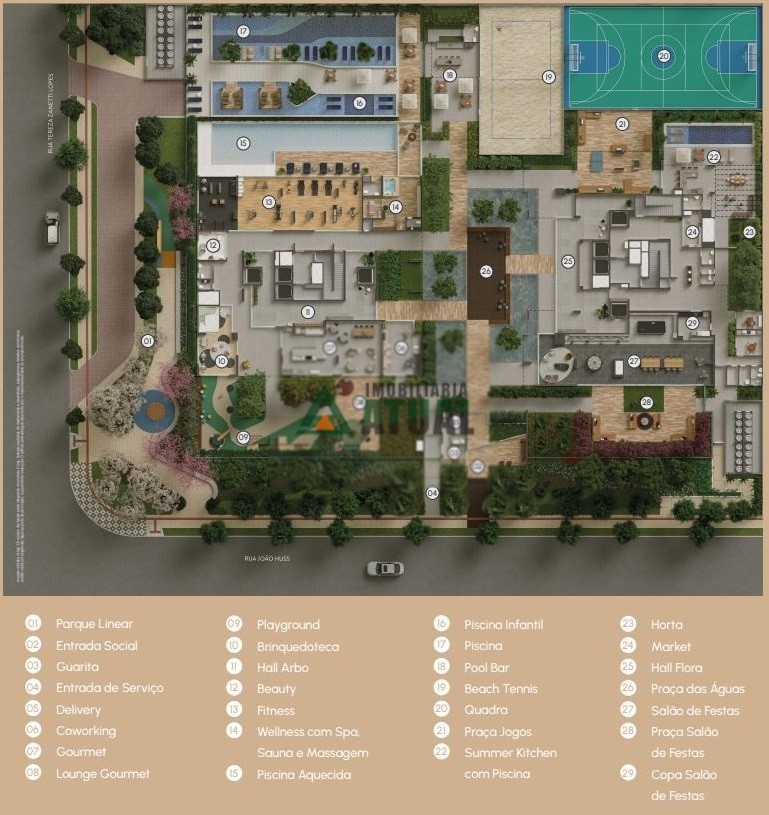 Apartamentos com opções de 02 e 03 suítes, e 02 vagas de garagem. Opções com varanda com churrasqueira, suíte master, lavado social, office, sala íntima, Home Theater, dentre outros diferenciais. Edifício com entrada social e de serviço, hall, delivery, coworking, mercado e horta. Área de lazer com área gourmet, lounge gourmet, playground, brinquedoteca, espaço fitness, spa, sauna, piscinas aquecida, infantil e comum, pool bar, quadra de beach-tennis, quadra poliesportiva, praça de jogos, summer kitchen, praça das águas e salão de festas.