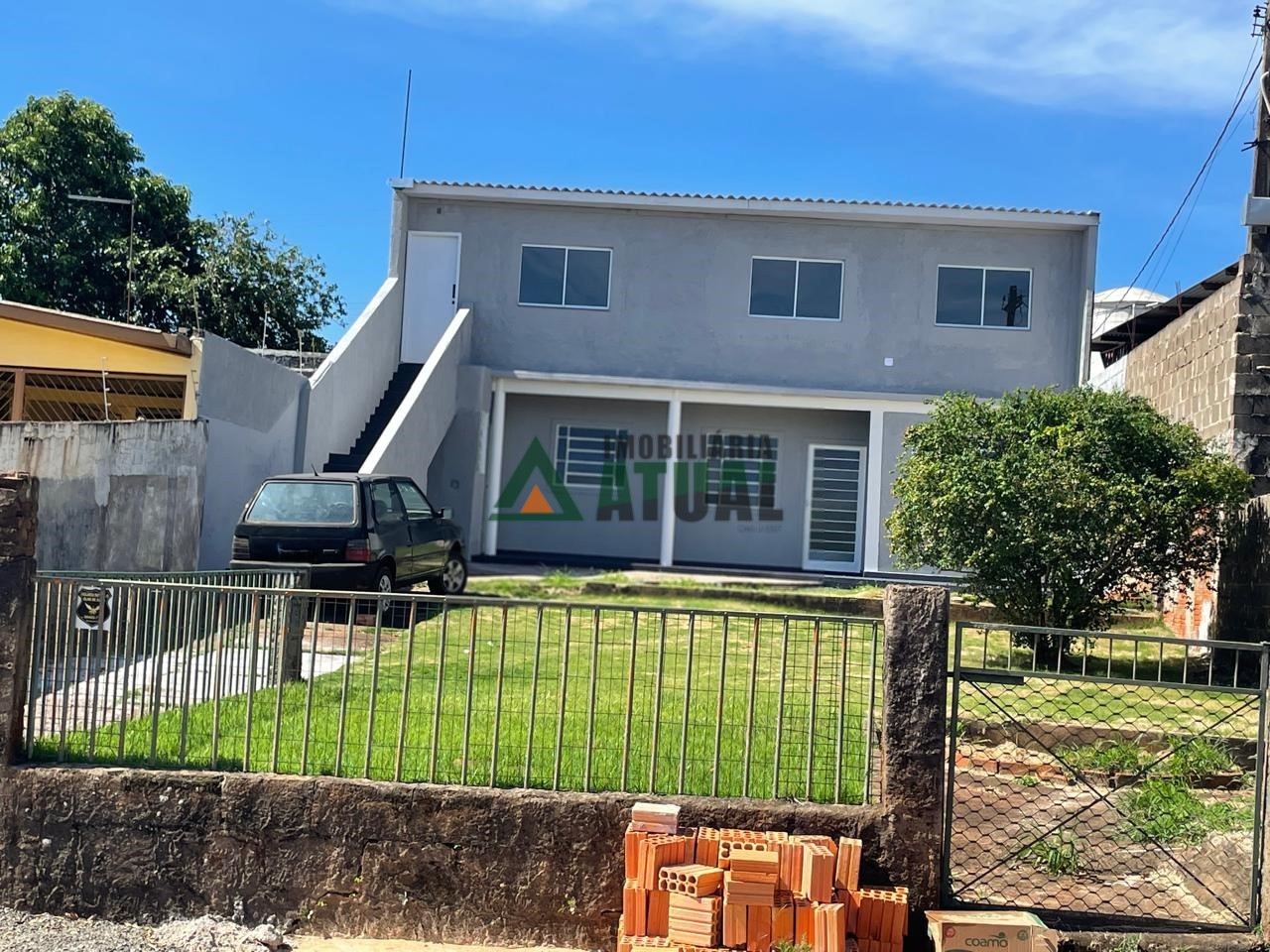 Casa com 02 quartos, sala, wc social, cozinha, área lateral com churrasqueira, varanda na frente, fundos com wc, garagem e edícula.