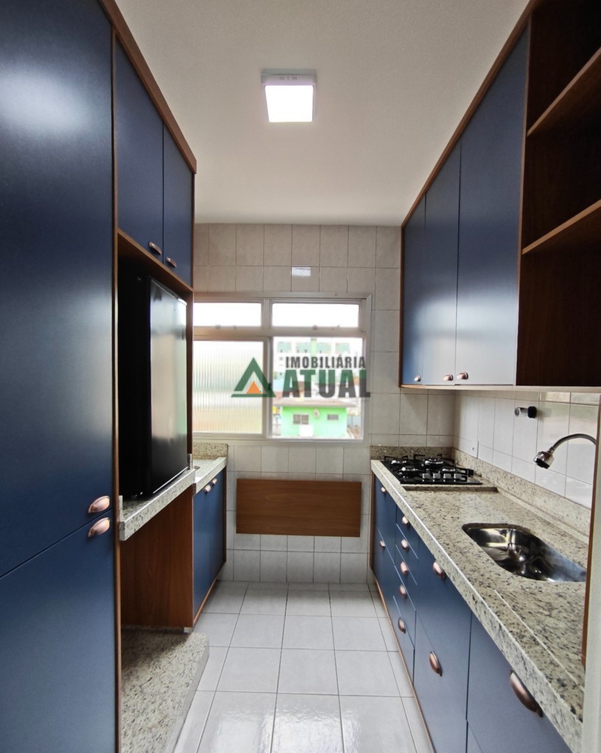 Mobiliado com guarda-roupa, mesa, balcão, armários, geladeira e fogão.